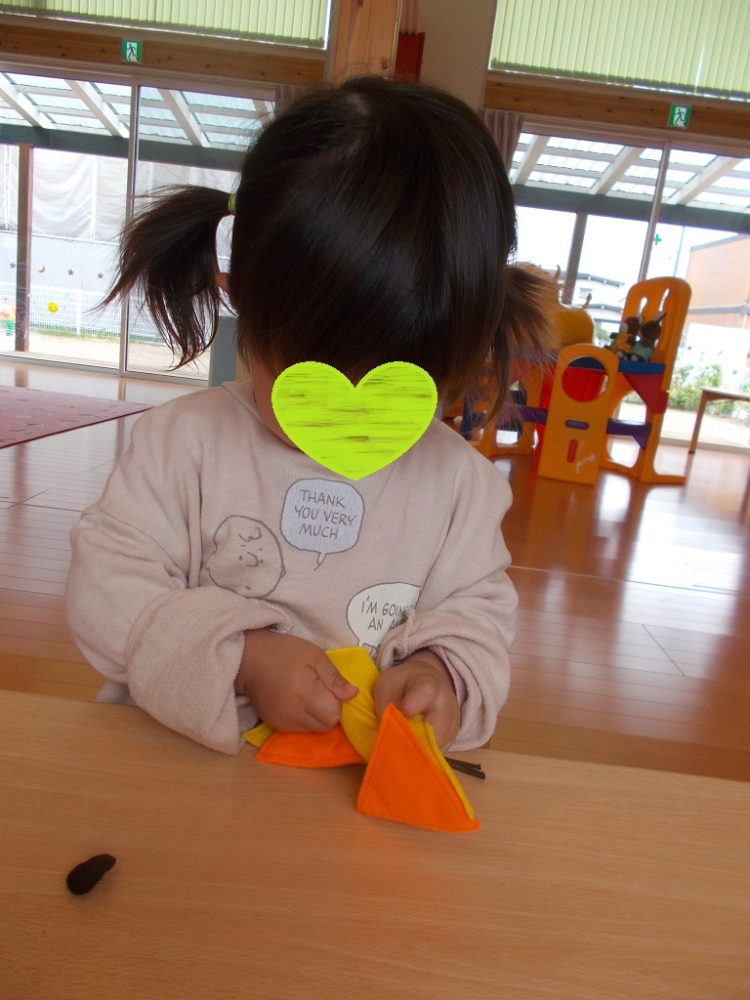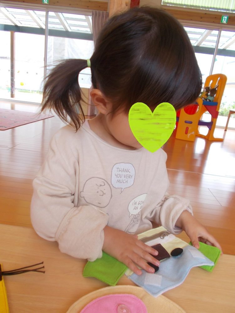 フエルトでできた動物は3つ、まずはブタさんの鼻(ボタンかけ)をしました。「穴からボタンを出して…」集中して取り組むSちゃん。次にファスナーのついたイヌさんやマジックテープのついたキツネさんもやってみました。それぞれ動物の顔や鼻、口、耳は、まるやさんかく、しかくになっていて、形の話題にも触れながら次々と楽しんでいました。
