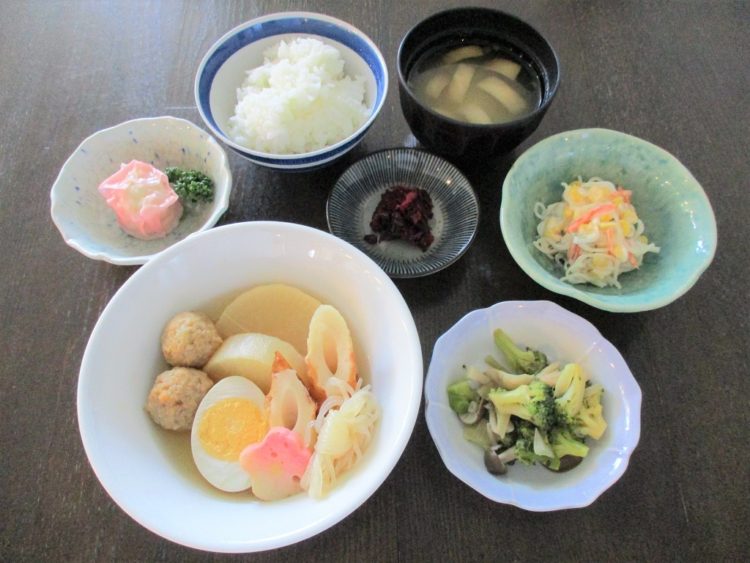 ご飯、板麩のみそ汁、おでん、ブロッコリーのソテー、さくらしゅうまい、春雨サラダ、