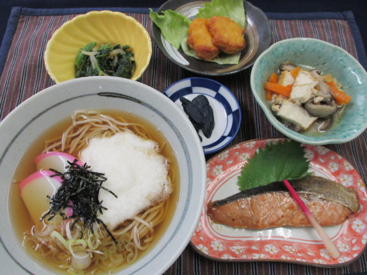 とろろそば、鮭の照り焼き、生揚げの肉味噌炒め、チキンナゲット、ほうれん草のナムル、なす漬