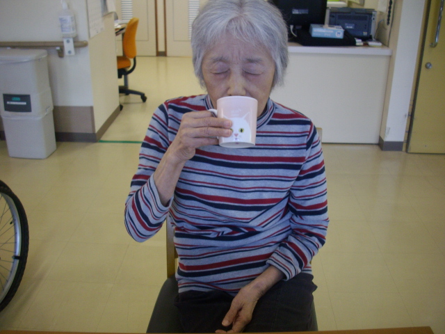 手を前に組んで音の出る絵本の曲に合わせ歌っていました。S氏は「オペラ歌手みたいしょ」と話されていました。「すばらしい歌声です」と話すと「そう」と何曲も歌ってくれました。数曲歌った後でS氏は「たくさん歌ったからのどが渇いたみたい」と話されていました。そこで桃のジュースを提供すると「おいしい・おいしい」とごくごく飲んでいました。