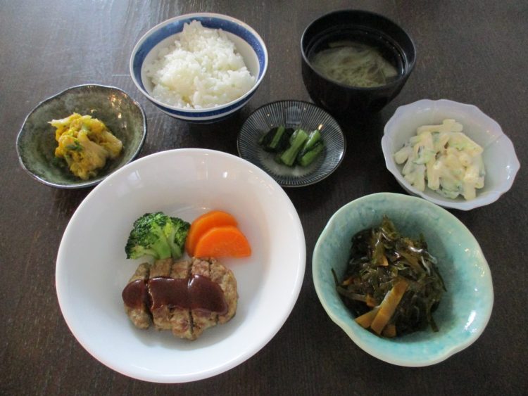 ご飯、キャベツのスープ、ハンバーグデミソース、すき昆布の煮物、マカロニサラダ、