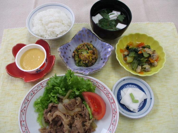 ご飯、はんぺんと三つ葉のみそ汁、牛肉と玉葱のオイスターソース炒め、チンゲン菜とあさりのソテー、きのこ南蛮、白かぶ漬、マンゴープリン