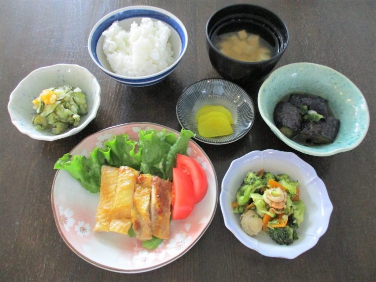 ご飯、豆腐のスープ、鶏肉の西京焼き、ブロッコリーと帆立の煮物、なすの煮浸し、