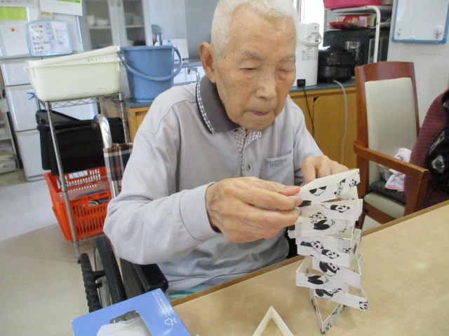 今日は暑いので、リハビリレクとして紙を積んでいく作業をしました!お客様は、崩れないように慎重に積んでおり、表情が真剣でとても集中していました。崩れてしまうと、悲しい表情をしており、誰にも言われるわけでもなくまた積み重ねており、心の中で頑張れ!と応援しました!(笑)