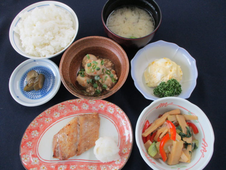 ご飯、なすといんげんのみそ汁、あじのごまダレ焼き、チンゲン菜とメンマのソテー、タマゴパスタ、里芋の鶏そぼろ煮、相馬きゅうり漬