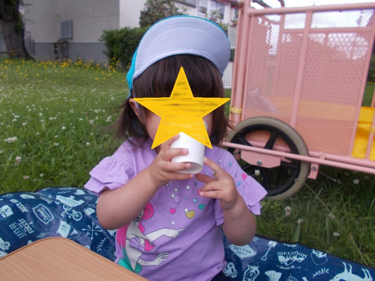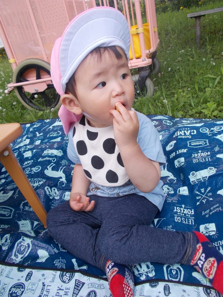 保育園に帰るとお弁当にしてもらった給食を、お外でもりもりおいしくいただきました。