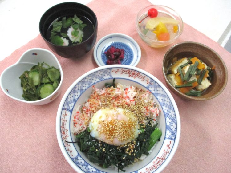 三色丼、なるとと三つ葉の清汁、わらびと生揚げの炒め物、胡瓜とめかぶの和え物、しば漬、
