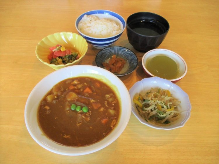 ご飯、わかめスープ、ポークカレー、もやしの炒め物、野菜サラダ、福神漬け、青リンゴゼリー
