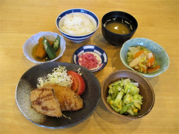 ご飯、えのきのみそ汁、サーモンチーズフライ、南瓜の炊き合わせ、白菜の煮浸し、