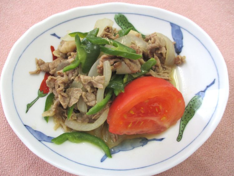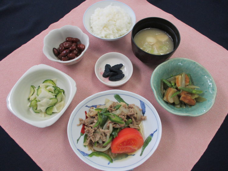 ご飯、里芋とねぎのみそ汁、牛肉と野菜の細切り炒め、ふきとさつま揚げの煮物、