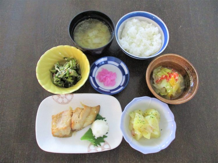 ご飯、白菜のみそ汁、ホッケ味噌漬け焼き、ジャーマンポテト、胡瓜の酢の物、チキンサラダ、