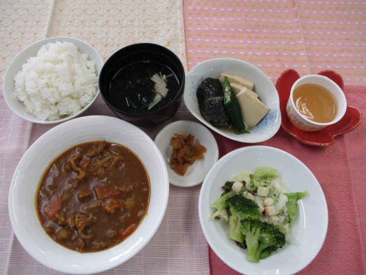 ご飯、わかめスープ、ビーフカレー、シーザーサラダ、なすと高野豆腐の生姜煮、福神漬、モモゼリー