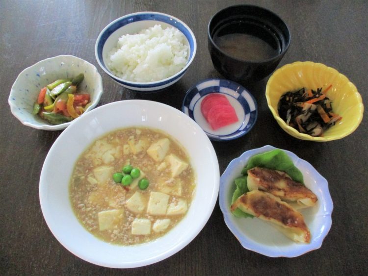 ご飯、中華風スープ、麻婆豆腐、焼き餃子、ひじきの炒め煮、アスパラサラダ、赤かぶ漬け
