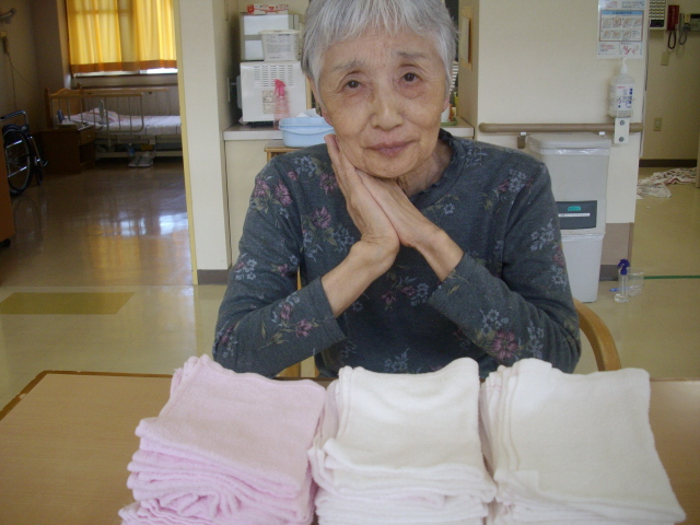 いつも手伝っているS様はあっという間にタオルを畳み終えてしまいました。カメラを向けるとニッコリ笑顔を見せるS様。とても頼もしいです!