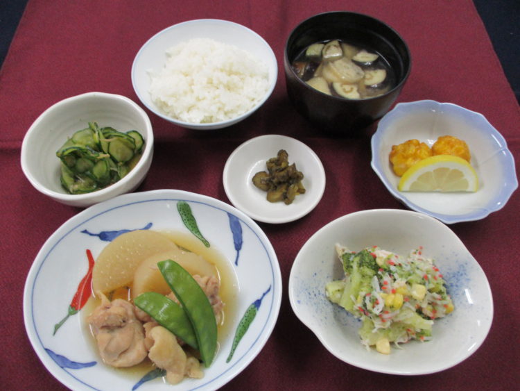 ご飯、なすと油揚げのみそ汁、鶏肉と大根の煮物、ブロッコリーとコーンのサラダ、とうもろこしのつまみ揚げ、きゅうりのなめ茸和え、味きゅうり漬