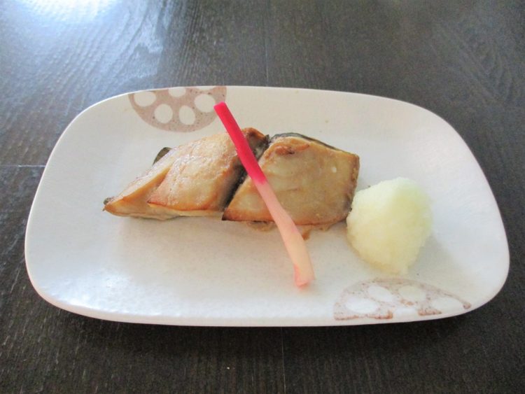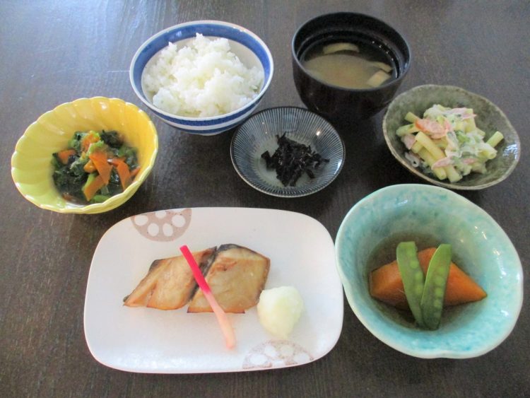 ご飯、もやしのみそ汁、あじの生姜醬油焼き、南瓜の煮物、青梗菜のお浸し、マカロニサラダ、