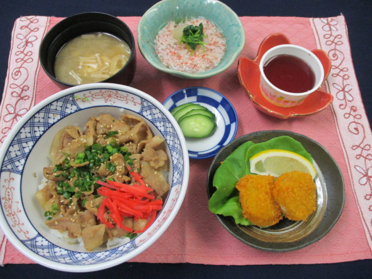 スタミナ丼、えのきと油揚げのみそ汁、帆立風味フライ、ふろふき大根かにあんかけ、きゅうり漬、ぶどうゼリー