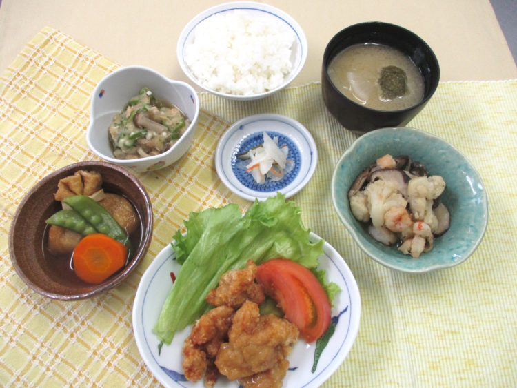 ご飯、大根ととろろ昆布のみそ汁、鶏肉の竜田揚げあんかけ、カリフラワーとえびのソテー、