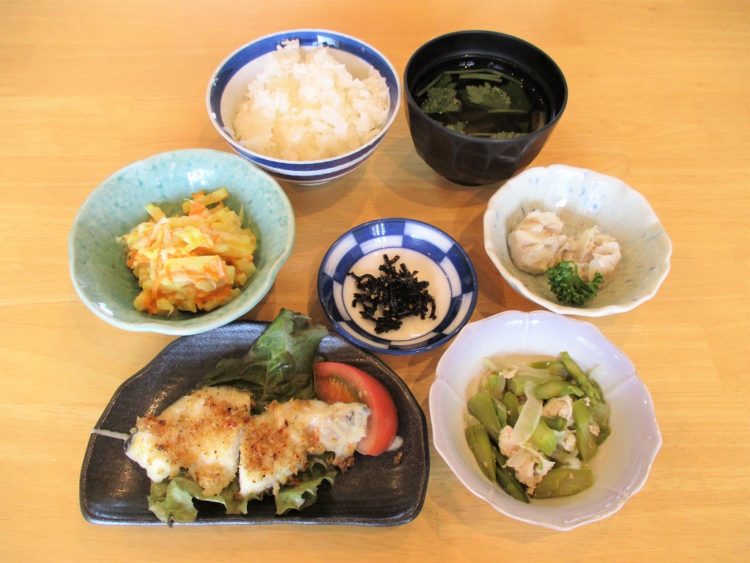 ご飯、椎茸のすまし汁、白身魚のハーブ焼き、アスパラの炒め物、シュウマイ、さつま芋サラダ、