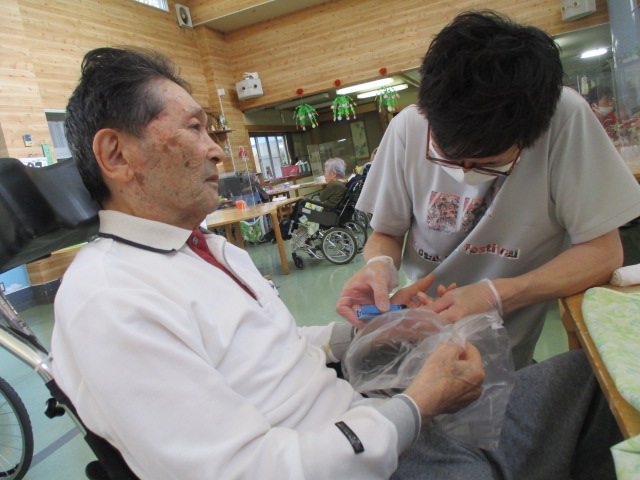 K様の爪切りをK介護員が細心の注意をはらって行っておりました。