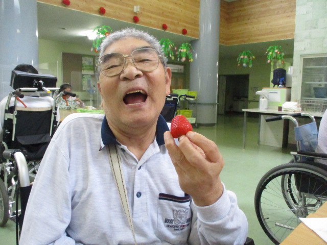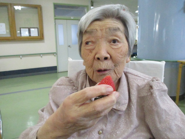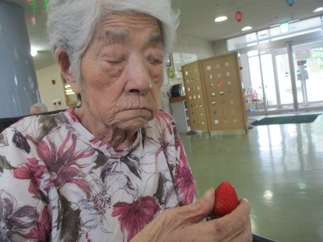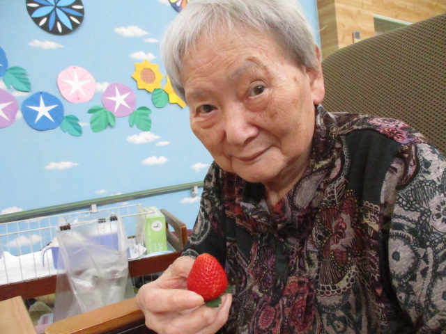 K様はイチゴを持って目を閉じてしまいました。