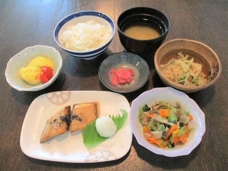 ご飯、わらびのみそ汁、あじの南部焼き、玉子と豆腐のしんじょ、青梗菜の炒め物、