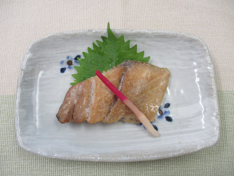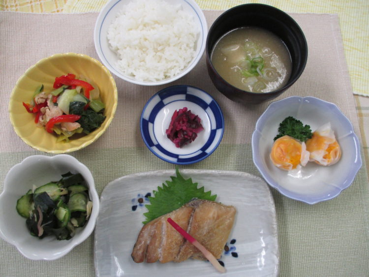 ご飯、里芋とねぎのみそ汁、あじの南部焼き、チンゲン菜の甘辛炒め、にんじんしゅうまい、わかめとみょうがの酢の物、しば漬