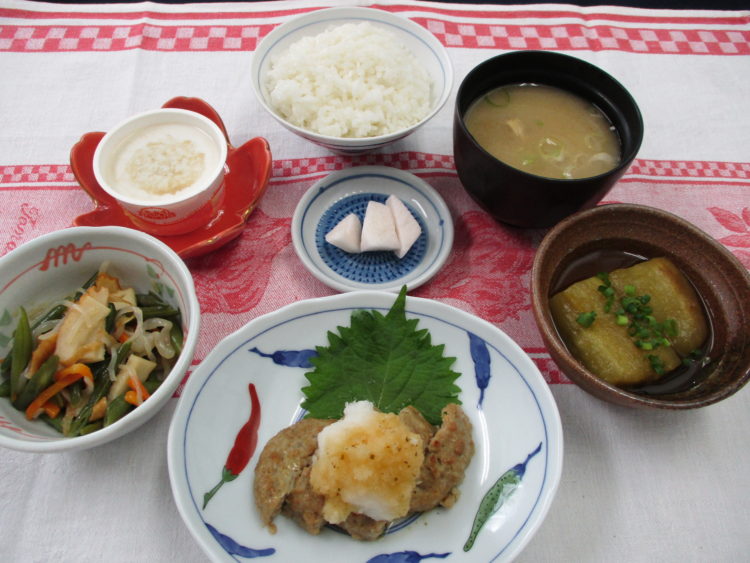 ご飯、あさりとねぎのみそ汁、和風ハンバーグ、いんげんとさつま揚げの炒め煮、焼きナスの生姜煮、長芋漬、コーヒーゼリー
