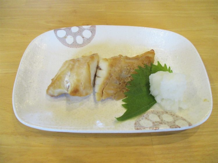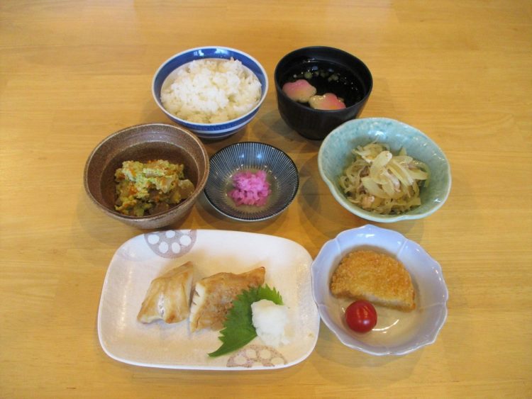 ご飯、花麩のすまし汁、赤魚のしょうゆ糀焼き、セロリのソテー、ポテトコロッケ、