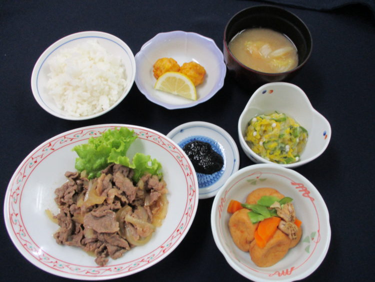 ご飯、白菜と板麩のみそ汁、帆立とがんもの煮物、オクラと菊のおろし和え、とうもろこしのつまみ揚げ、のり佃煮