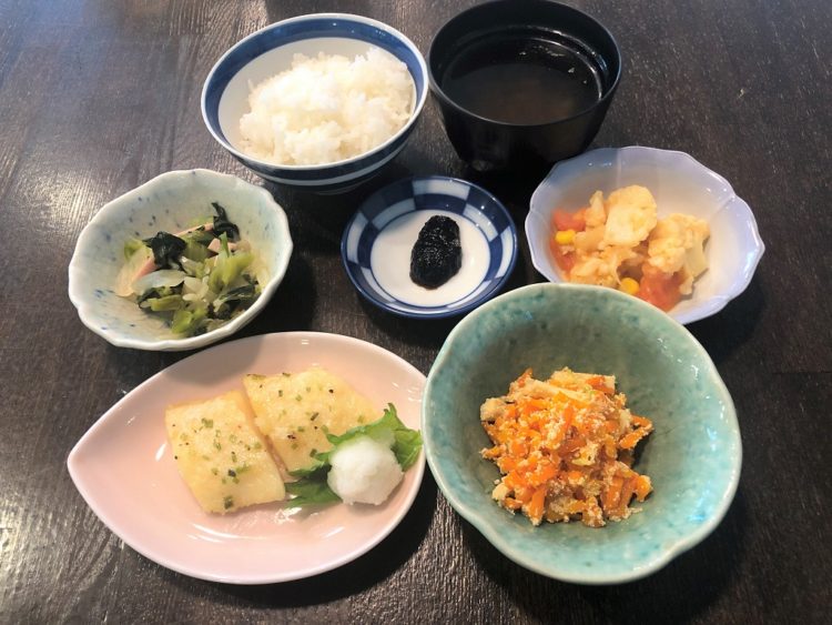 ご飯、春雨のスープ、カレイねぎ塩焼き、青梗菜のソテー、人参の子和え、カリフラワーサラダ、