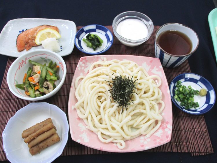 ざるうどん、ますの幽庵焼き、アスパラと鶏肉のソテー、たたきごぼう、野沢菜切漬、