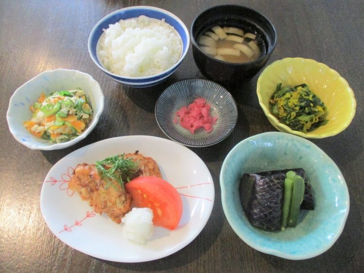 ご飯、みょうがのみそ汁、イカメンチ、なすといんげんの煮付け、鶏ささみの胡麻だれサラダ、