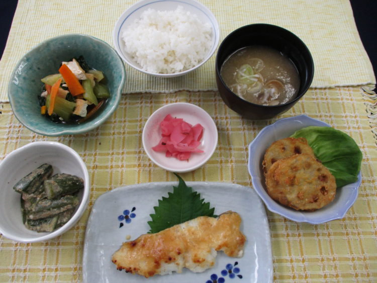 ご飯、しめじとねぎのみそ汁、たらの味噌マヨネーズ焼き、チンゲン菜と生揚げの炒め物、レンコンはさみ揚げ、オクラのごま和え、梅吹雪漬
