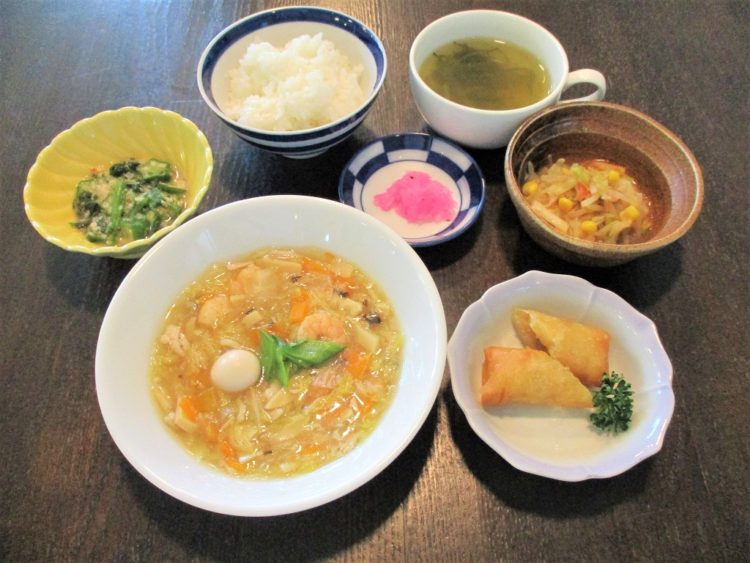 ご飯、めかぶと春雨のスープ、八宝菜、春巻き、モロヘイヤと長芋のお浸し、レタスサラダ、