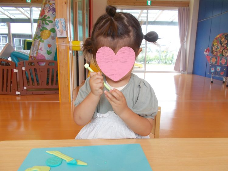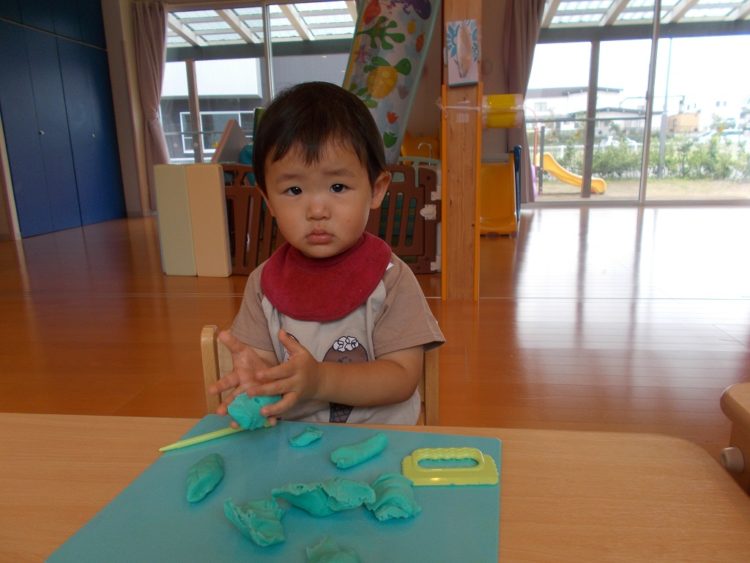 今日は粘土遊びをして楽しみました。指先や手の平を上手に使ってコロコロ粘土を丸めたり、ヘラを使って粘土を細かく刻んだり・・・思い思いに集中して楽しむ様子が見られました^^