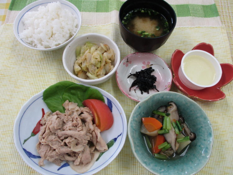 ご飯、豆腐とあさつきのみそ汁、豚肉の生姜焼き、かぶと帆立の煮物、キャベツのピーナッツ和え、しそ昆布、和梨ゼリー