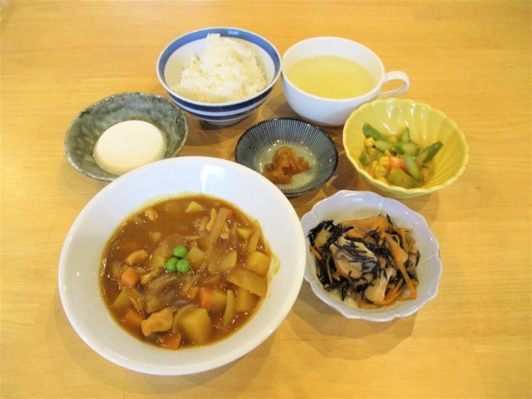 ご飯、コンソメスープ、チキンカレー、ひじきの煮物、アスパラサラダ、杏仁豆腐、福神漬け