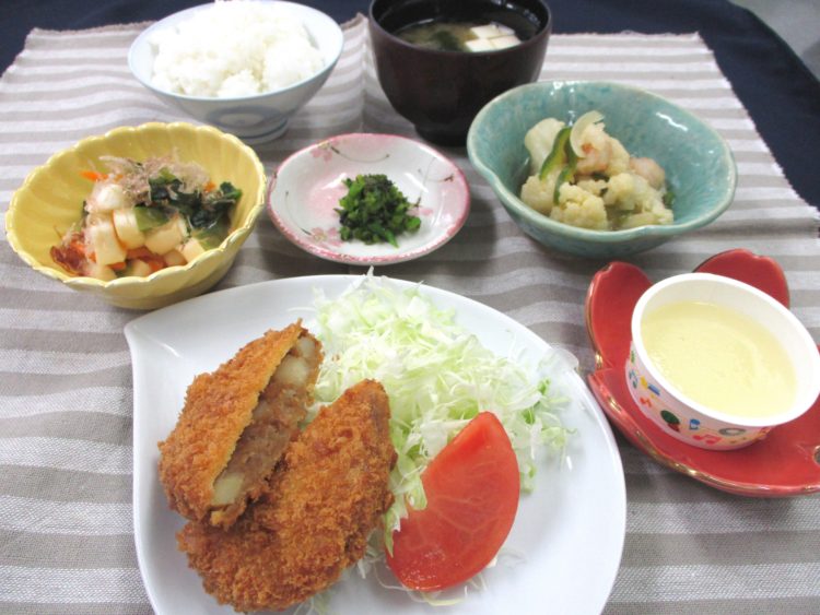 ご飯、豆腐とわかめのみそ汁、肉じゃがコロッケ、カリフラワーとえびのソテー、
