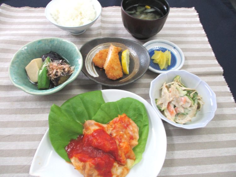 ご飯、キャベツとコーンのスープ、鶏肉のチーズ焼き、なすと高野豆腐の煮つけ、イカフライ、