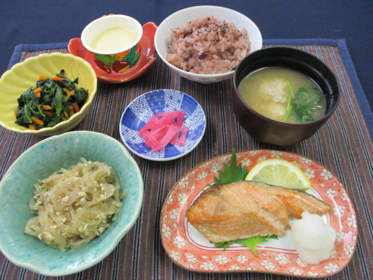 お赤飯、えび団子と三つ葉のみそ汁、鮭のレモン風味焼き、春雨とれんこんのソテー、ほうれん草の磯部和え、赤かぶ漬、栗のムース