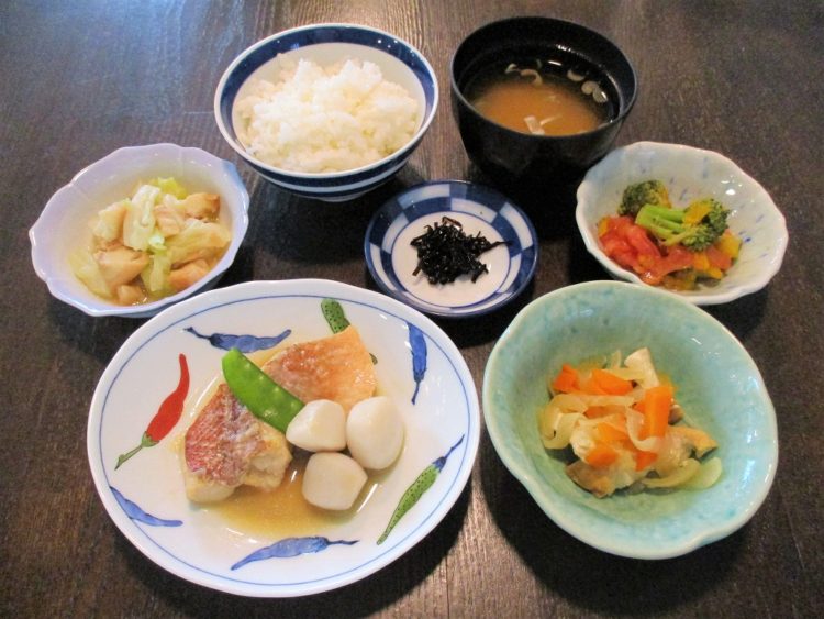 ご飯、さもだしのみそ汁、赤魚の味噌煮、生揚げの炒め物、車麩の辛子和え、トマトのサラダ、