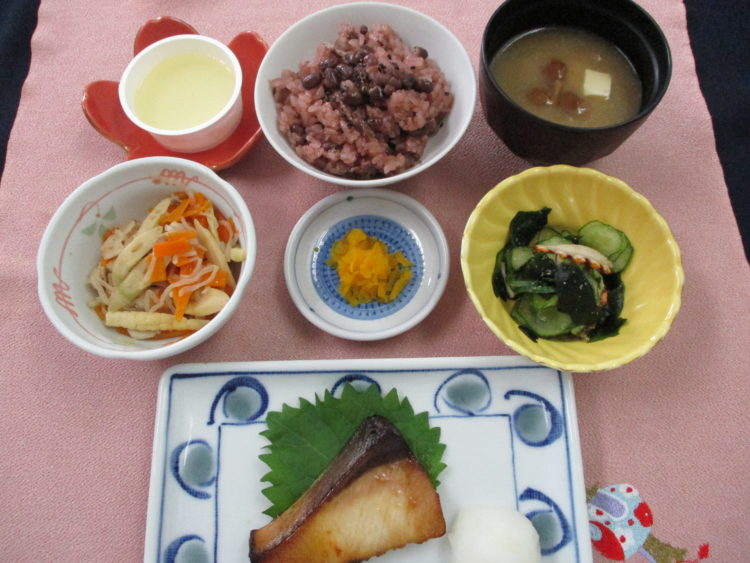 お赤飯、豆腐となめこのみそ汁、ぶりの照り焼き、細竹と豚肉の炒め煮、きゅうりとたこの和え物、つぼ漬、和梨ゼリー