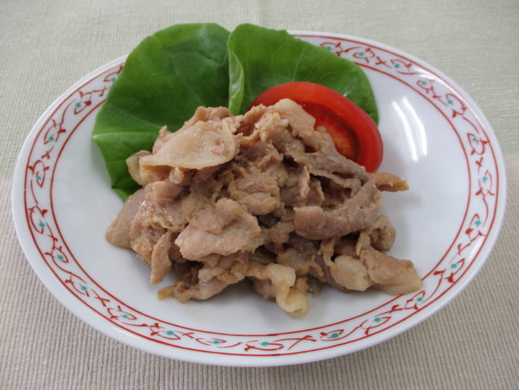 ご飯、はんぺんとあさつきのみそ汁、豚肉の生姜焼き、チンゲン菜としらすの炒め物、アスパラとツナのサラダ、たたきごぼう、野沢菜漬