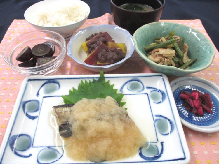 ご飯、玉葱とわかめのみそ汁、さんまのおろしあんかけ、いんげんと豚肉の炒め物、