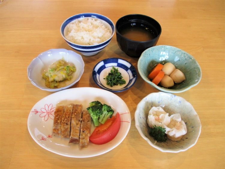 ご飯、玉葱のみそ汁、豚肉のパン粉焼き、里芋の煮物、蒸しシュウマイ、白菜の辛子和え、