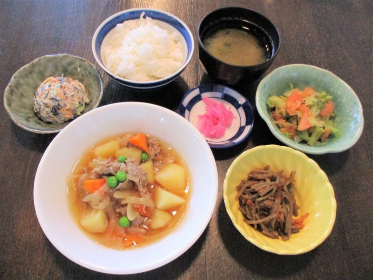 ご飯、だいこん葉のみそ汁、肉じゃが、きんぴらごぼう、ひじきの白和え、レタスのサラダ、