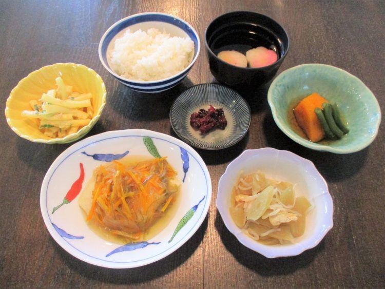 ごはん、花麩のすまし汁、カレイの中華あんかけ、ふきの炒め物、南瓜の煮物、マカロニサラダ、