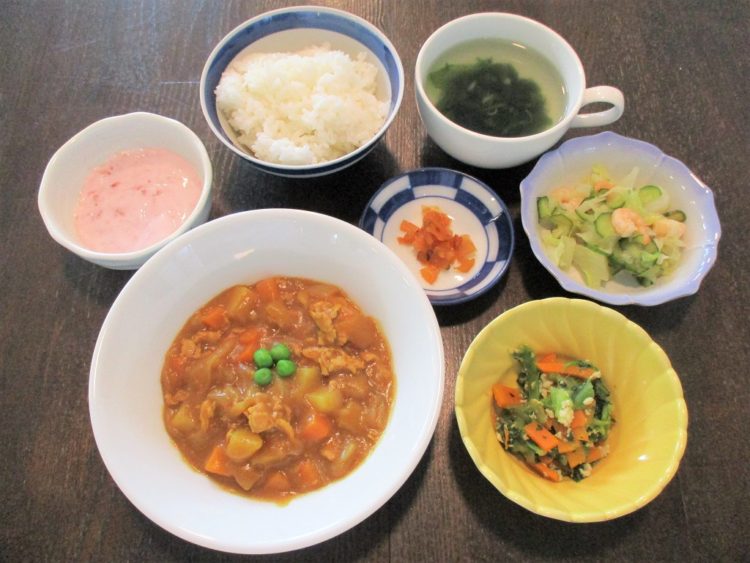 ごはん、わかめスープ、ポークカレー、小松菜のソテー、えびと胡瓜のサラダ、福神漬け、