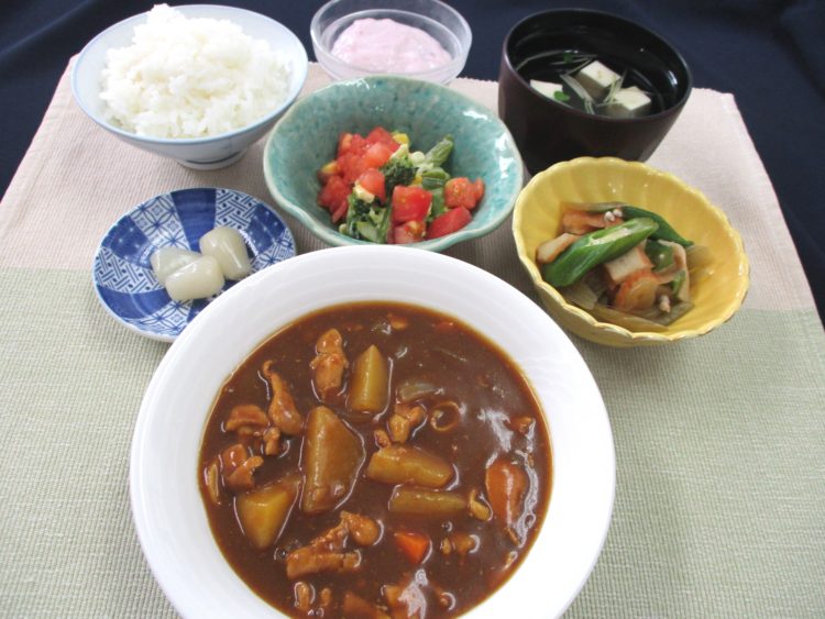 ご飯、豆腐とかいわれのスープ、チキンカレー、トマトとアスパラのサラダ、